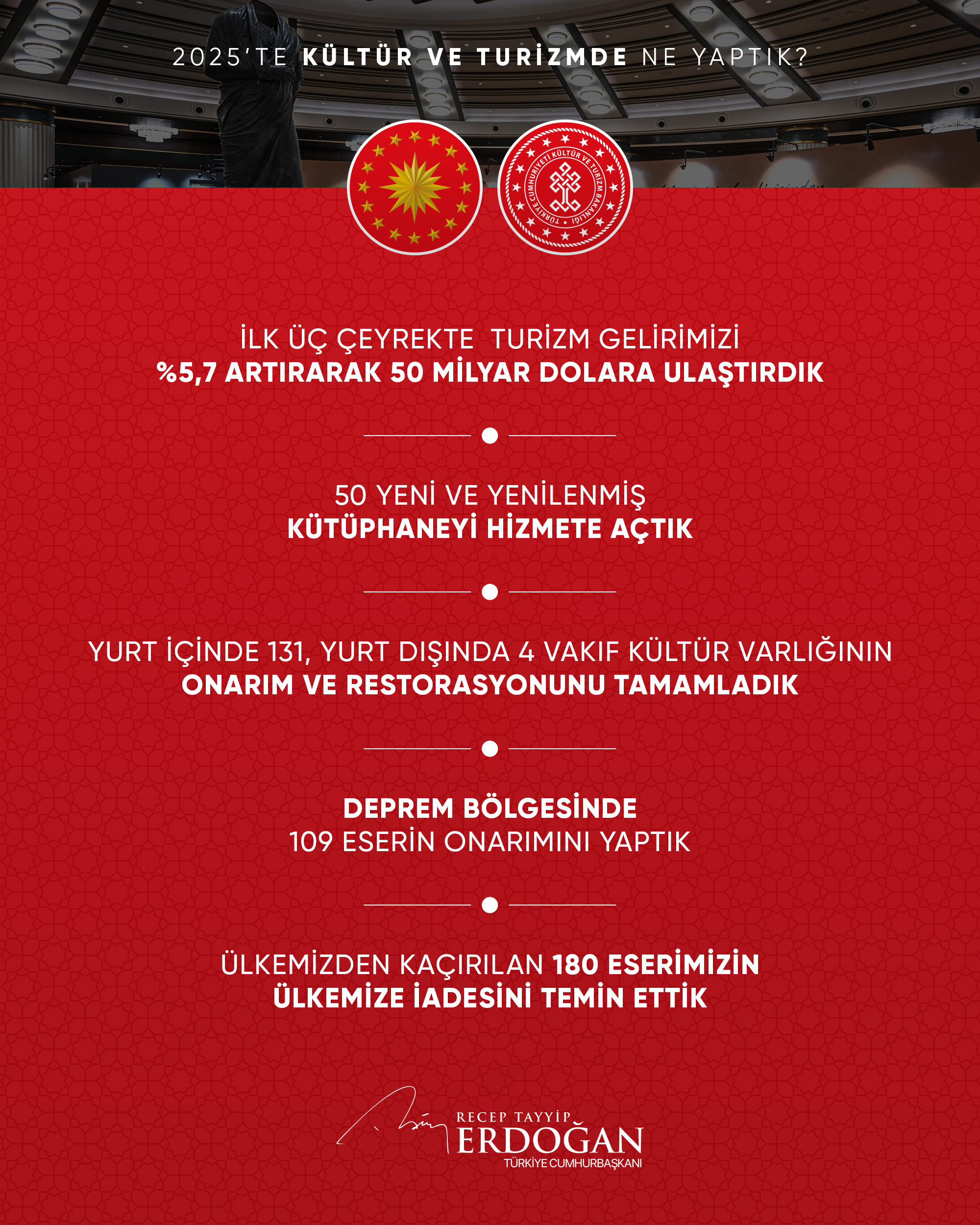 Cumhurbaşkanı Recep Tayyip Erdoğan, sosyal medya hesabından, ''2025'te kültür ve turizmde ne yaptık?'' başlığıyla yaptığı paylaşımda kültür ve turizm alanındaki son gelişmelere ilişkin değerlendirmelerde bulundu. Erdoğan, 2025 yılının ilk üç çeyreğinde turizm gelirlerinin geçen yılın aynı dönemine göre yüzde 5,7 artarak 50 milyar dolara ulaştığını açıkladı.