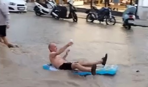 Muğla’nın Fethiye ilçesinde etkili olan sağanak yolları göle çevirirken, turistler sel sularında eğlendi.