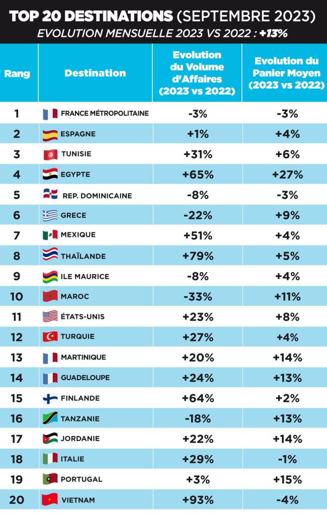 Tunus ve Mısır onu takip ediyor (sırasıyla yüzde 31 ve yüzde 65) artarken Türkiye yüzde 27 gelişme ile 12 sırada yer aldı. En büyük düşüşler, depremin ağır bedelini ödeyen Yunanistan -yüzde 22 ve Fas’ta - yüzde 33)yaşandı. Dominik de gerileyenler arasında. (L’ Echo Tourisme Orkestra Barometresi)Fransa'da Eylül ayı seyahat satışları: