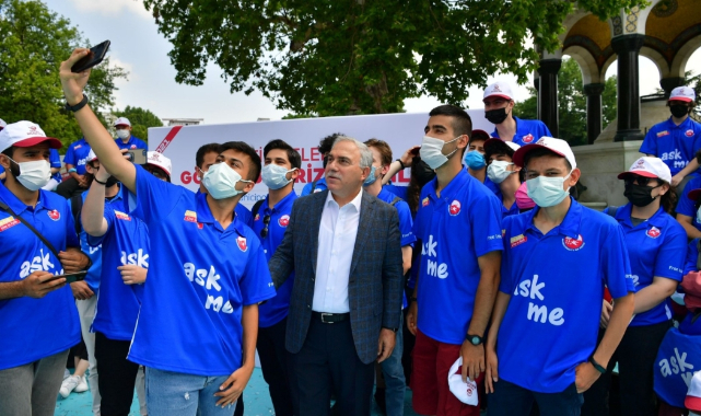 Sultanahmet Meydanı’nda gerçekleştirilen törende gençlere seslenen Başkan M. Ergün Turan, “Medeniyetlerin kesişme noktası ve yüzük taşı İstanbul’da, İstanbul’un da tarihi merkezi olan Fatih’te, yaz tatillerini kendilerini geliştirmek ve turistlerimize yardımcı olmak için projemizde yer alarak değerlendiren tüm elçilerimizi öncelikle tebrik ediyorum. Türkiye’deki en önemli turizm destinasyonlarından biri şu an içinde bulunduğumuz alan. İstanbul’a gelen her turistin uğradığı bir mekân olan Sultanahmet’teyiz. Yerebatan Sarnıcı, Ayasofya ve Sultanahmet Camii, dikilitaşlar derken kısa mesafede dahi onlarca eser sayabiliriz. Türkiye’deki kültürel mirasın %11’i, İstanbul’daki mirasımızın ise %40’ının yer aldığı Fatih’te gençlerimiz turistlerle aramızda köprü görevini üstlenecekler. Lise ve üniversite seviyesinde pırıl pırıl gençlerimiz projemiz kapsamında turizmin en yoğun olduğu lokasyonlarda hem ülkemizin yüzü olacaklar, hem de dil ve tarih bilgilerini geliştirecekler. Ülkemiz adına örnek teşkil edecek olduğunu düşündüğüm bu proje ile hepimize güzel bir turizm sezonu diliyorum” dedi.