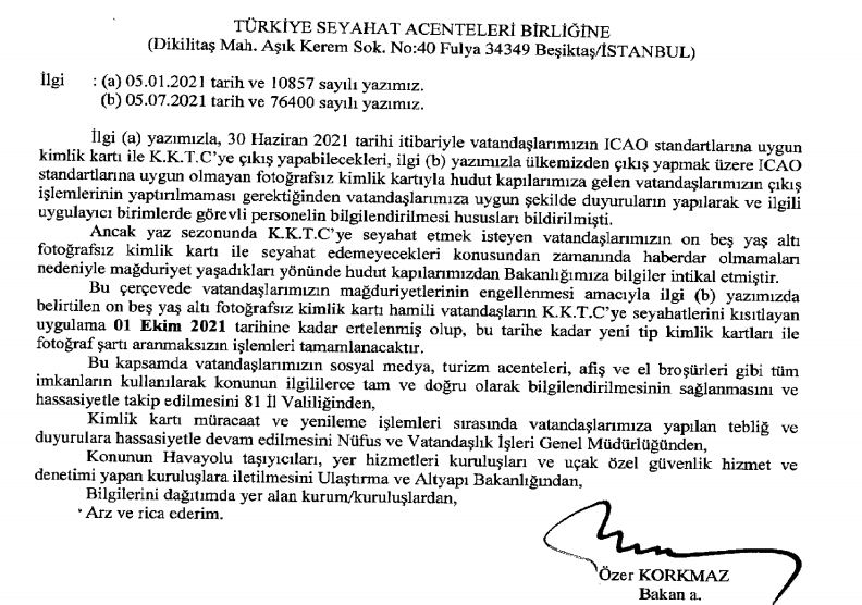 İçişleri Bakanlığı, KKTC'ye kimlik kartı ile yapılan çıkışlarla ilgili yazı gönderdi. tÜrsab tarafından yapılan duyuruda, ''On beş yaş altı fotoğrafsız kimlik kartı hamili vatandaşlarımızın KKTC’ye seyahatlerini kısıtlayan uygulamanın 01 Ekim 2021 tarihine kadar ertelendiği ve bu tarihe kadar yeni tip kimlik kartları ile fotoğraf şartı aranmaksızın işlemlerinin tamamlanacağı tarafımıza bildirilmiştir'' denildi. T.C. İçişleri Bakanlığı Resmi Yazısı