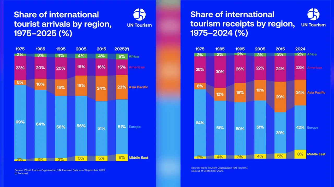 UN Tourism’in yayımladığı yeni veriler, uluslararası turizmin son yarım yüzyılda geçirdiği dönüşümü çarpıcı biçimde ortaya koydu.1975’te dünya genelindeki uluslararası turist varışlarının yüzde 92’si Avrupa ve Amerika kıtalarında gerçekleşirken, bugün tablo tamamen değişmiş durumda. Ekonomik büyüme, gelişen havayolu bağlantıları ve daha erişilebilir seyahat olanakları, Asya-Pasifik başta olmak üzere Orta doğu ve Afrika’nın turizmde yükselişini hızlandırdı.Turist akışlarında yeni dönemUN Tourism’in paylaştığı ilk grafik, bölgelerin küresel turizmden aldığı paylardaki dönüşümü gösteriyor:Avrupa, 1975’teki yüzde 69’luk payından 2025 tahmininde yüzde 51’e gerilese de hâlâ dünyanın en çok ziyaret edilen bölgesi konumunda.Asya-Pasifik, yüzde 5’ten yüzde 23’e yükselerek küresel turizmin yeni ağırlık merkezi hâline geldi.Orta Doğu, ivmeli yükselişiyle yüzde 2’den yüzde 6’ya çıktı.Afrika, yüzde 2’den yüzde 5’e istikrarlı bir artış yakaladı.Amerika kıtaları, yüzde 23’ten yüzde 15’e gerileyerek pay kaybı yaşayan bölgeler arasında yer aldı.Bu dağılım, uluslararası Turizm hareketliliğinin artık çok daha dengeli bir coğrafi yapıya yayıldığını gösteriyor.