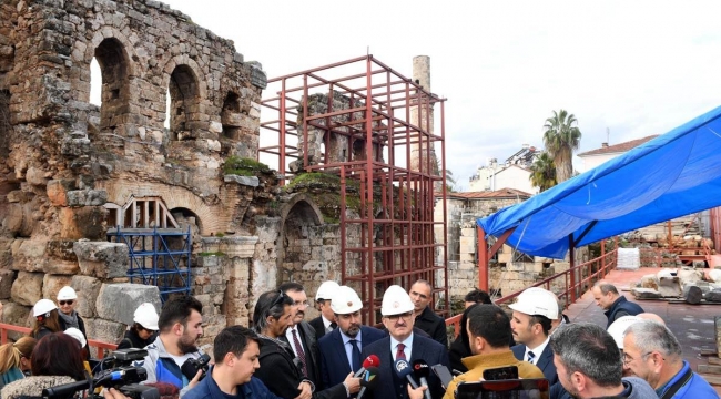 Caminin kentteki ilk Türk İslam eserlerinden olduğunu belirten Vali Karaloğlu; “Duvarları güçlendirme ve koruma çalışmaları devam ediyor. Minaremizin arka tarafının güçlendirme işlemleri tamamlandı. Şu anda da camiye girerken son cenahta kalan tamamlanma işine başlandı. Bu camiye bizim yaptığımız 7. müdahale. Bizden önce 6 müdahale daha geçirmiş. Bu camide Roma döneminden Bizans’tan, Selçuklu’dan, Osmanlı’dan ve cumhuriyetten izler var. En ciddi restorasyonu 1974 yılında geçirmiş. Bizim amacımız kurulumuzun da bilim heyetimizin de bize yol göstermesiyle cami tamamlandığında ibadet için veya ziyaret için giren herkes bu bahsetmiş olduğumuz 7 dönemi de hissedebilsin arzusundayız. Bu cami içerisinde Roma’dan kalan izler, Bizans’tan kalan izler var. Cami adeta bir müze gibi her dönemden izler taşımakta. Hem cami hem de müze olarak burada hizmet versin. Bizim amacımız ve gayemiz bu. Biz yaptığımızı bütün çalışmaları Antalya Kültür Varlıkları Koruma Kurulu’nun kararları doğrultusunda ve bilim heyetimizin yol göstermesi durumunda yapıyoruz. Şu ana kadar çalışmalarımız çok iyi gidiyor. Vakıf İl Müdürlüğümüze kültür ve turizm bakanımıza vakıflar genel müdürlüğümüze çok teşekkür ediyorum.” dedi.