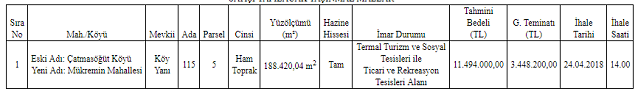 Yozgat, Sorgun’da bulunan termal turizm ve sosyal tesisleri ile ticari ve rekreasyon tesisleri alanı imarlı arsa, kapalı teklif usulüyle ihale edilecek. İhalenin muhammen bedeli 11 milyon 494 bin lira olarak belirlendi. Resmi Gazete'de yayımlanan ihale kararı şöyle:TAŞINMAZ MAL SATILACAKTIR