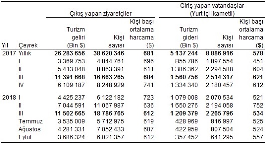 Ülkemizden çıkış yapan ziyaretçi sayısı 2018 yılı III. çeyreğinde bir önceki yılın aynı çeyreğine göre %12,7 artarak 18 milyon 786 bin 765 kişi oldu. Bunların %84,7’sini 15 milyon 904 bin 734 kişi ile yabancılar, %15,3’ünü ise 2 milyon 882 bin 31 kişi ile yurt dışında ikamet eden vatandaşlar oluşturdu.