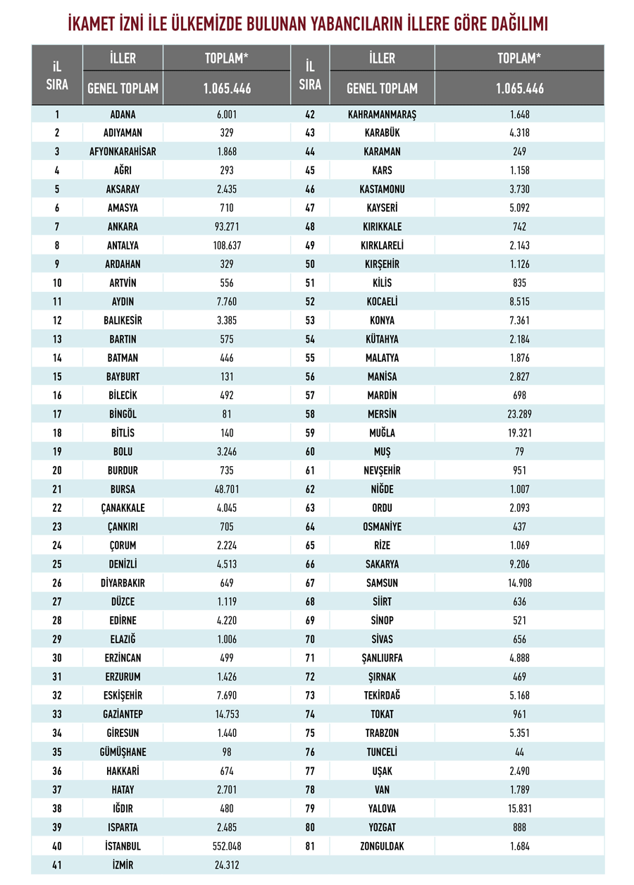 TÜRKİYE'YE GÖÇ EDENLERİN SAYISI ARTIYORTürkiye İstatistik Kurumu (TÜİK) tarafından iki yılda bir yayımlanan Uluslararası Göç İstatistikleri 2018 yılı rakamlarına göre, Türkiye'ye göç edenlerin sayısı bir önceki yıla göre yüzde 23,8 artarak 577 bin 457 kişi oldu. Türkiye'ye göç eden bu nüfusun yüzde 52,7'sini erkek, yüzde 47,3'ünü ise kadınlar oluşturdu.TÜRKİYE'YE EN FAZLA 25-29 YAŞ GRUBUNDAKİ NÜFUS GÖÇ ETTİTürkiye'ye 2018 yılında göç edenlerin yaş gruplarına göre, yüzde 11,9 ile 25-29 yaş grubu, yüzde 11,5 ile 20-24 ve yüzde 10,3 ile 30-34 yaş grubu izledi.EN FAZLA GÖÇ ALAN İLLER İSTANBUL, ANKARA VE ANTALYA Türkiye'ye 2018 yılında göç edenlerin illere göre dağılımında ilk sırayı İstanbul aldı. İstanbul'a 201 bin 957 kişi göç etti. İstanbul'u sırasıyla 71 bin 337 kişi ile Ankara, 36 bin 674 kişi ile Antalya, 22 bin 660 kişi ileTürkiye'ye göç eden yabancı nüfusun yüzde 23,6'sını Irak vatandaşları oluştururken bunu sırasıyla yüzde 9,6 ile Afganistan, yüzde 8,4 ile Suriye,yüzde 7,5 ile Türkmenistan ve yüzde 6,8 ile İran vatandaşları izledi.TÜRKİYE'DE İKAMET İZNİ ALAN YABANCI SAYISIGöç İdaresi İşleri Genel Müdürlüğü istatistiklerine göre, Türkiye'de ikamet izni alan yabancı sayısı 2018 yılında 856 bin 470 olarak gerçekleşti. 2019 yılında bu sayısı 1 milyon 65 bin 446'ya ulaştı.Göç İdaresi İşleri Genel Müdürlüğü'ne göre Antalya'da 108 bin 637 ikamet izni bulunan yabancı yaşıyor.2018 yılında Türkiye'de ikamet izni bulunan yabancıların ülkelere göre dağılımında ilk sırayı Irak vatandaşları aldı. Türkiye'de ikamet izni bulunan ilk 10 ülke şöyle:1. Irak (104.444), 2. Suriye (99.643), 3. Türkmenistan (67.522), 4. Azerbaycan (65.027), 5. İran (44.315), 6. Afganistan (39.283), 7. Rusya (36.507), 8. Özbekistan (34.727), 9. Mısır (25.784), 10. Kırgızistan (25.645)ÇALIŞMA İZNİ VERİLEN YABANCILARIN SAYISIGöç İşleri İdaresi Genel Müdürlüğü tarafından 2018 yılında Çalışma izni verilen yabancıların ülkelerine göre dağılımında ise Suriye ilk sırada bulunuyor. Çalışma izni verilen yabancıların dağılımı şöyle.1. Suriye (16.783), 2. Gürcistan (8.076), 3.Kırgızistan (7.441), 4. Türkmenistan (5.985), 6. Ukrayna (4.040), 7. Özbekistan (3.573), 8. Nepal (3.012), 9. Çin Halk Cumhuriyeti (2.659), 10. İran (2.565)ANTALYA'DA YAŞAYAN YABANCI SAYISITUİK'in 2017 yılı rakamlarına göre, Antalya'da yaşayan yabancılar arasında ilk sırayı Rus vatandaşları alıyor. Bu ülkeyi sırasıyla, Alman, Kırgızistan, Ukrayna, Kazakistan, İran, Azerbaycan, Irak, Gürcistan ve Özbekistan vatandaşları izliyor.