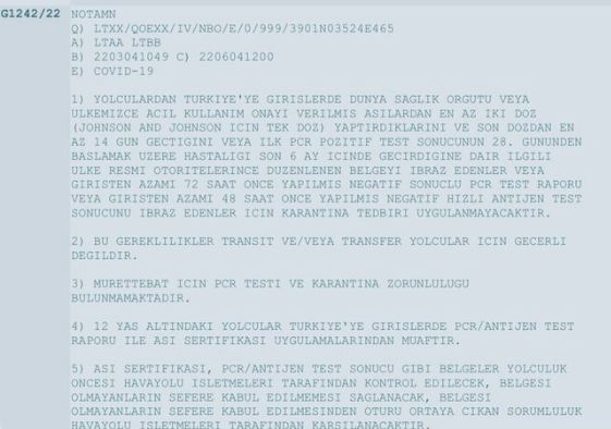 SHGM'nin sosyal medya hesabından yapılan duyuruda, yurt dışından Türkiye'ye giriş yapacak yolcuların, COVID-19 tedbirleri kapsamında uymaları gereken kurallar ile ilgili yayımlanan NOTAM’larda güncelleme yapıldığı belirtildi. Yapılan değişiklikler şöyle: