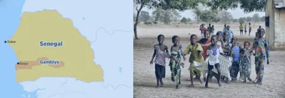 Afrika’nın batısında Senegal’in içine girip kaybolmuş gibi olan Gambiya haritası ve çocuklar…
