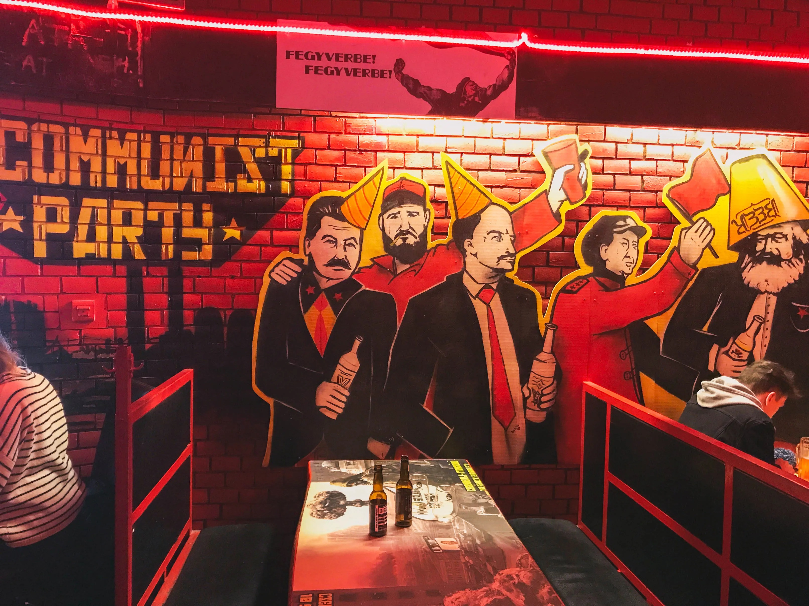 The Central Market'ın arka sokaklarında komünizm temalı ilginç bir bar olan Red Ruin'in dekoru dikkat çekiyor. Girdiğinizde ilk gördüğünüz şey; doğum günü şapkaları içinde, coşkulu bir "komünist parti" düzenleyen Karl Marx, Vladimir Lenin, Joseph Stalin ve Mao Zedong'un bir duvar resmi oluyor. Floresan kırmızısı aydınlatma, içinden yüzünüzü geçirebileceğiniz bir Marx ve Lenin karton posteri ve "Joseph Stylin" yazısıyla Stalin'in pop art kalıpları gibi ilginç çizimler var. Barın labirent gibi, kırmızı tuğlalı bodrum katında daha fazla duvar sanatı örneği görebiliyorsunuz.