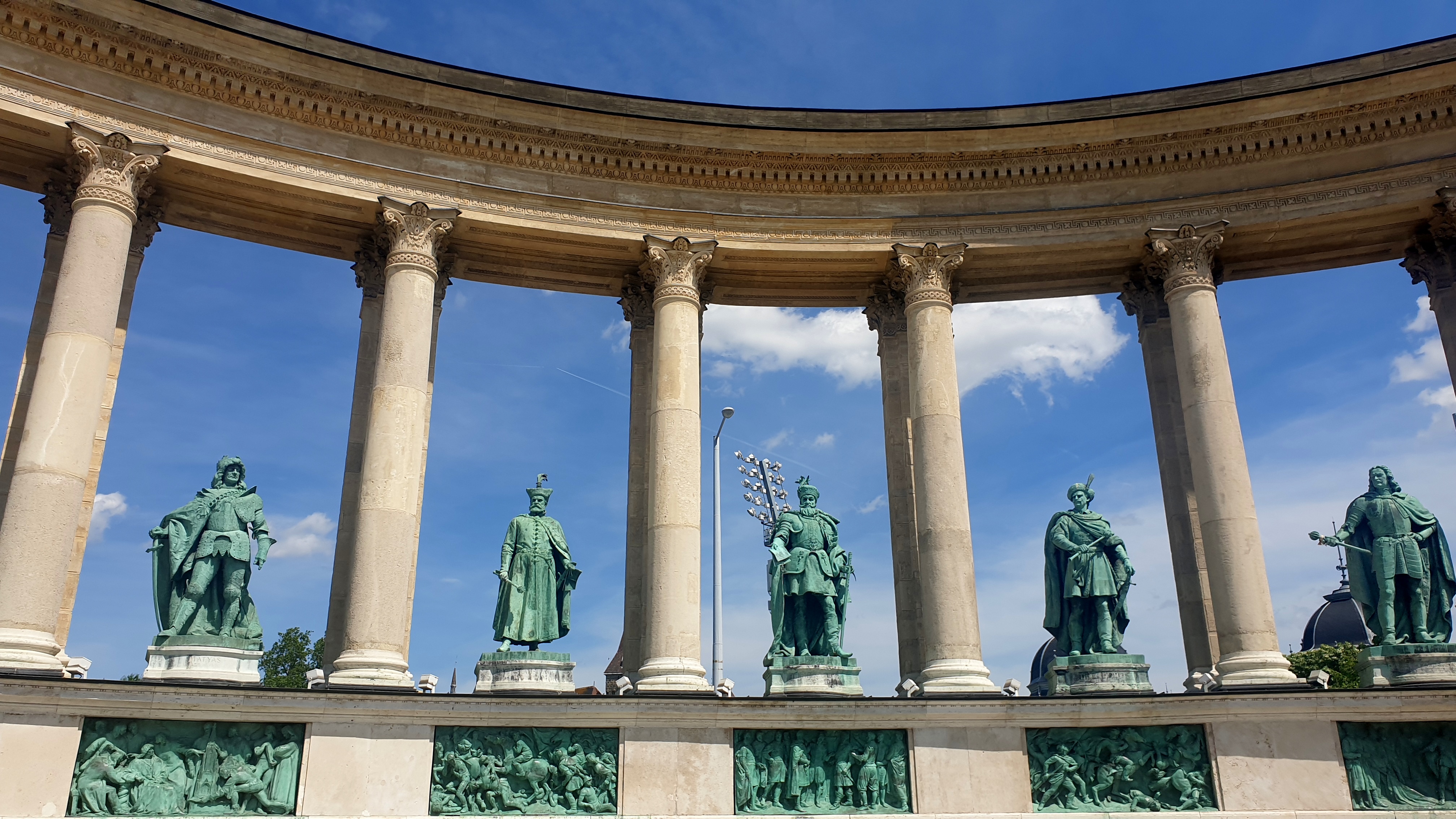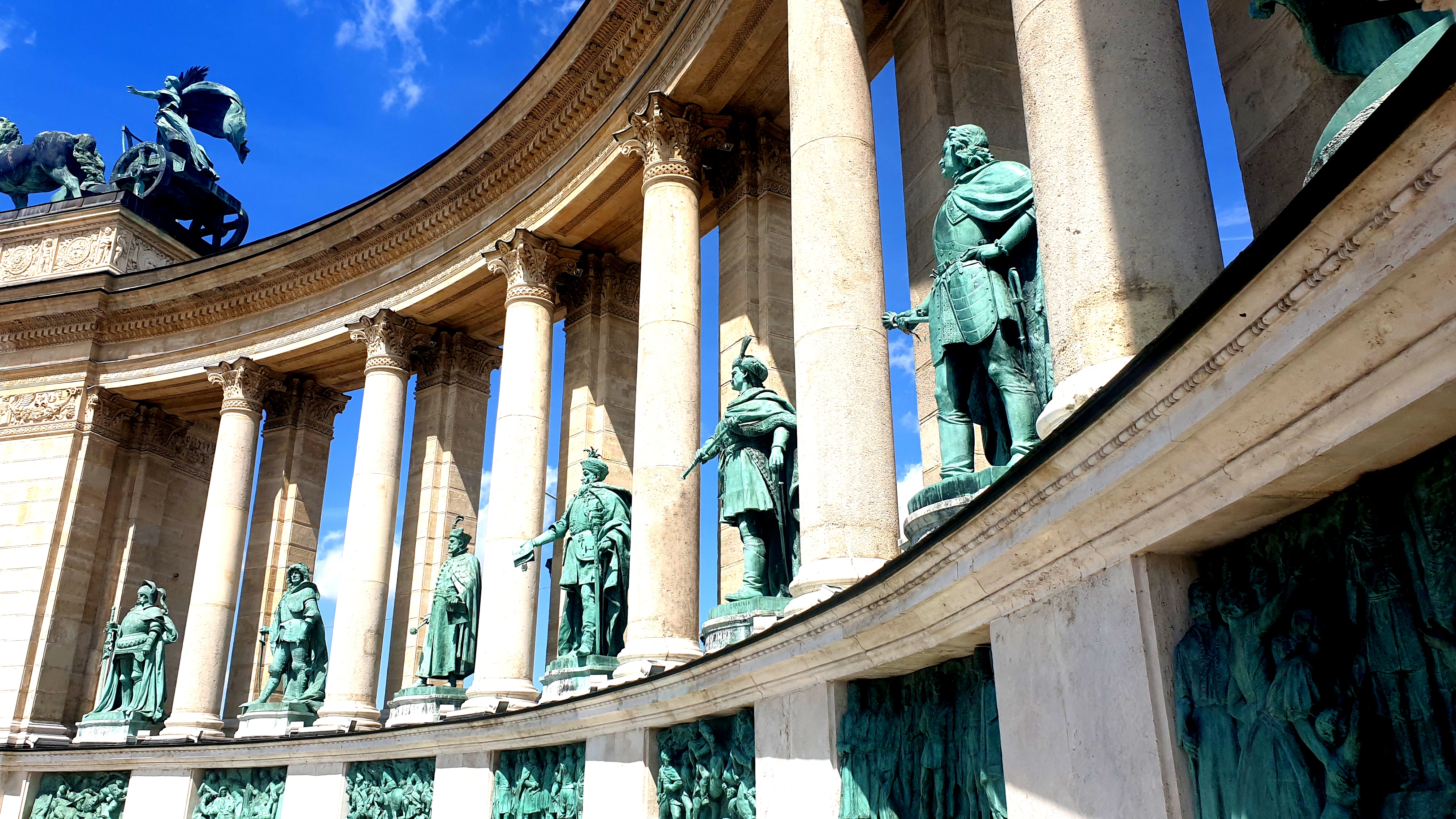 Bunların önünde 7 kurucu kabile lideri ve onların da önünde Macaristan'ın bağımsızlığı için savaşanları onurlandıran Kahramanlar Anıtı bulunuyor. Anıtın arkasında gerçek boyutlarından daha büyük; detaylı kral, kraliyet ailesi üyesi ve Macar tarihinin önemli şahsiyetlerinin heykelleri bulunuyor. Sütun ve kaidenin etrafındaki heykel grubu, yarım daire şeklinde düzenlenmiş iki sütun sırasıyla görsel bir bütünlük oluşturmaktadır. Kahramanlar Meydanı, ziyaretçilere Macar tarihi dersi sunuyor. Buradaki sanat eserleri, ülkenin tüm tarihini kucaklıyor; aynı zamanda barış zamanının sanatçılarını, sanat eserlerini ve Macar kültürünün değerlerini de hatırlatıyor. Bunun sonucunda da Budapeşte'nin Kahramanlar Meydanı ve Andrassy Bulvarı, UNESCO Dünya Miras Listesi'nde yer almıştır.